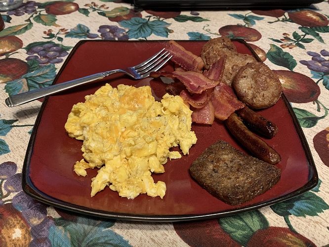 .Mid-day meal… Scrambled Eggs, Bacon, Sausage links and Turkey Scrapple