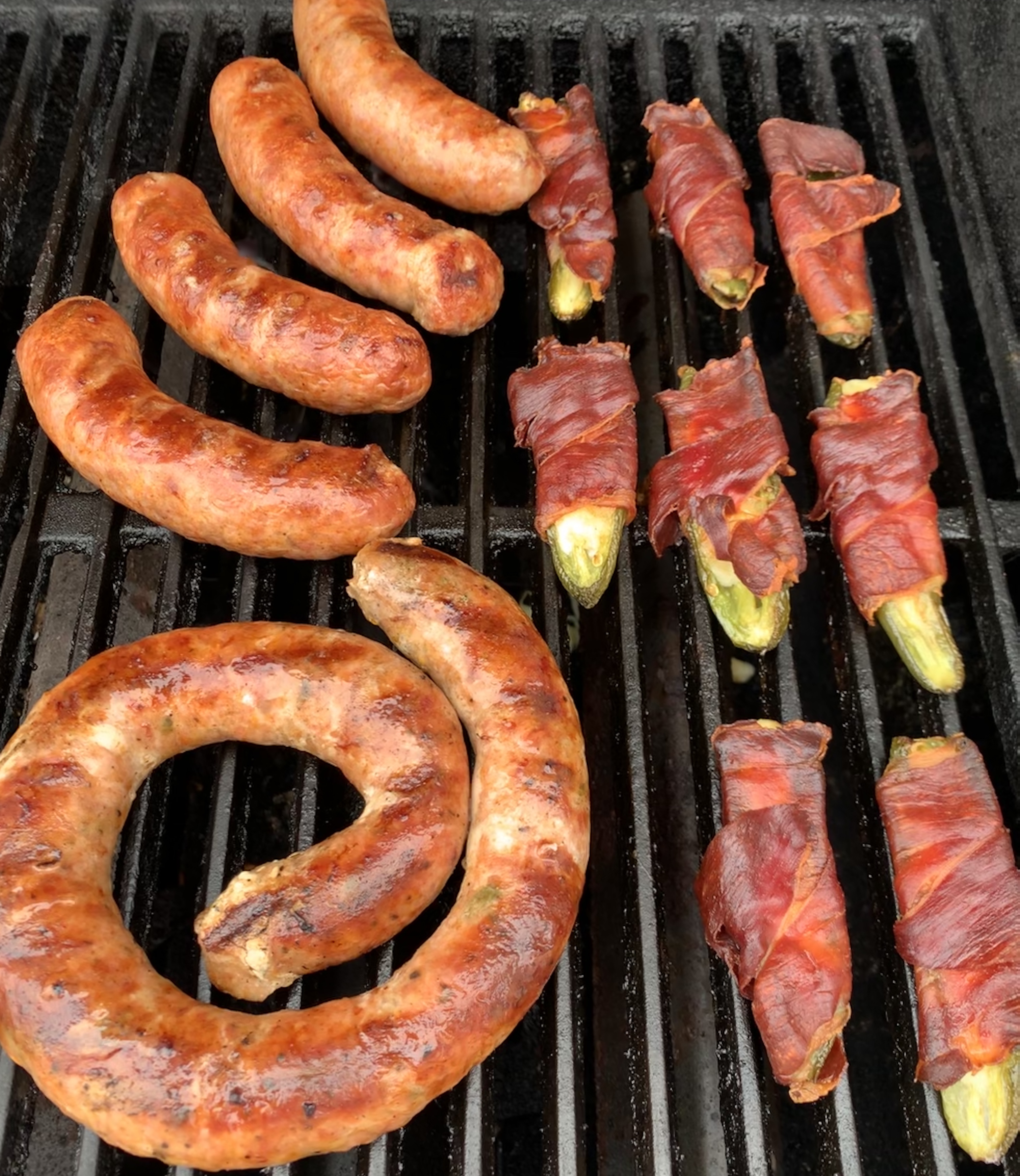 Two kinds of local sausage (coil is cheddar and jalepeno) plus some smoked prosciutto wrapped jalepenos