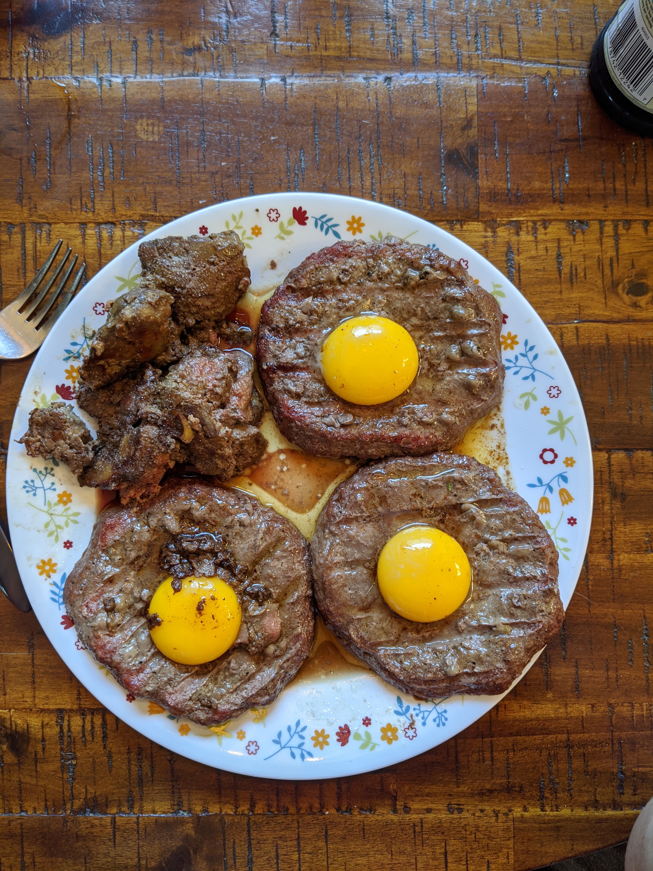 IP chuck, eggs, calf liver and burger from yesterday with a mixed green salad