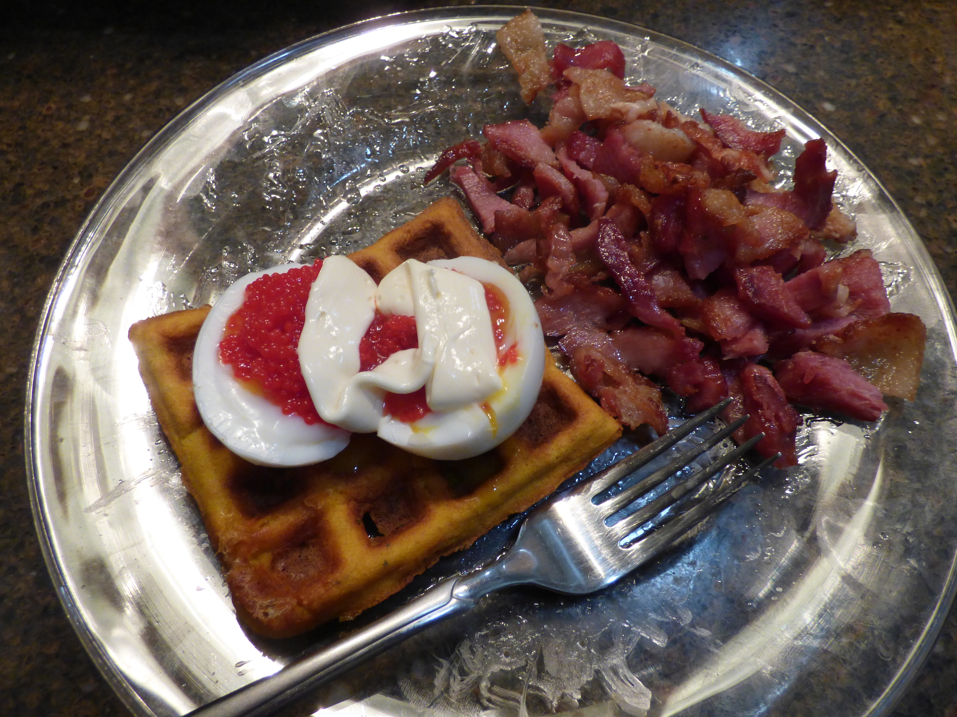 Brunch: Bacon, chaffle, soft boiled egg with caviar and mayo. I have a large jar of this caviar and I love it.
