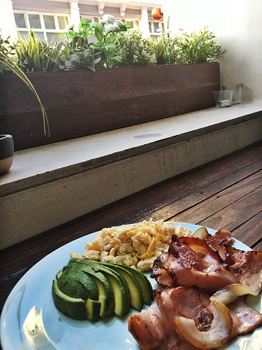 Love this thread, but have always watched from sidelines. So today am gonna join in. Nothing revolutionary; bacon fried in duck fat with eggs scrambled in the pan to soak up all the fat with some Thai spices along with and avocado drenched with fresh lemon juice. Always a classic