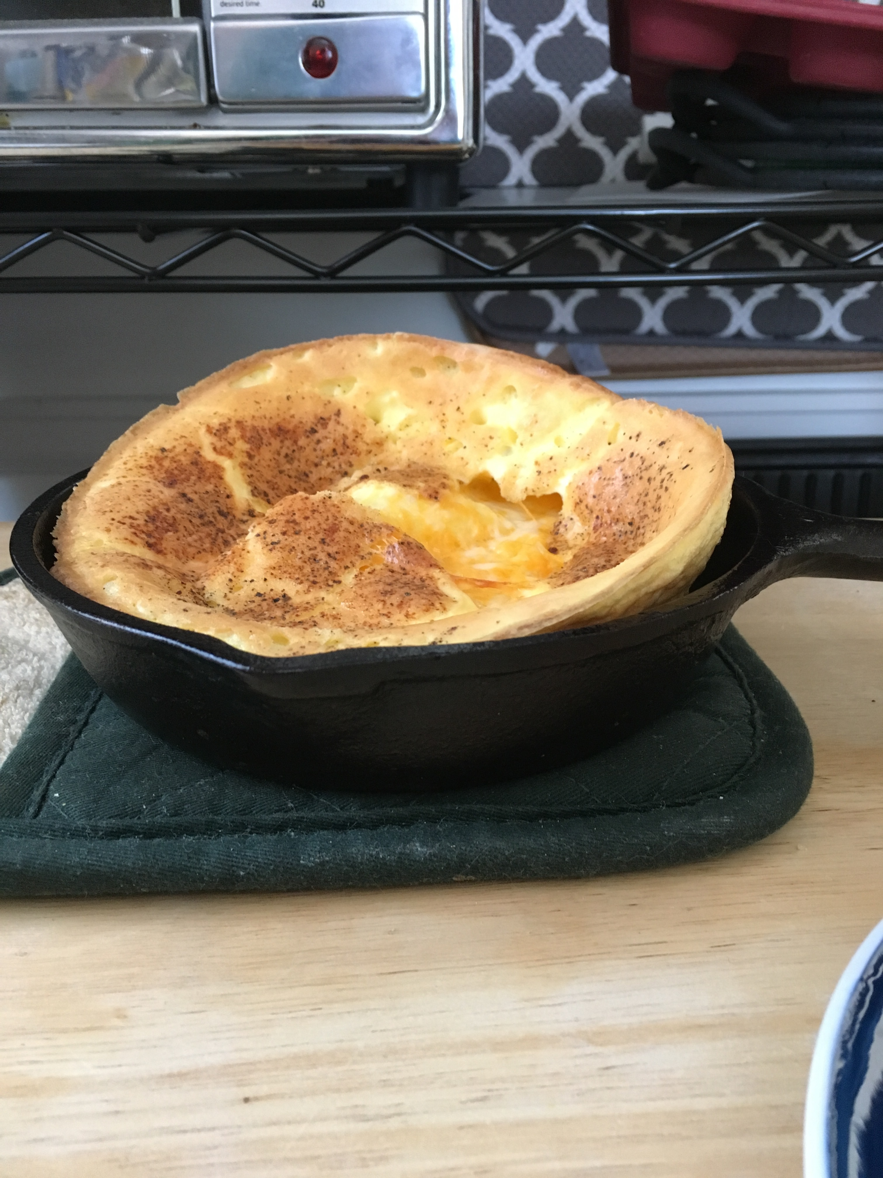 Beat eggs and HWC until frothy, pour in hot cast iron (this one is 6.5 inches). Split cheese stick in half, drop in eggs then put cast iron in toaster oven for a few minutes.